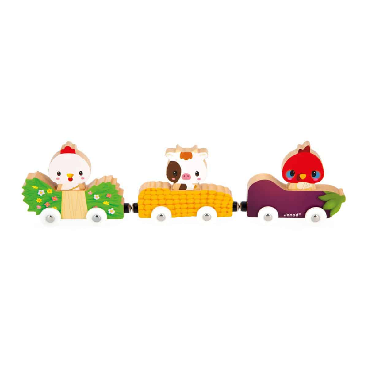 Grâce aux magnets, les animaux tiennent bien en place sur leur véhicule et peuvent être interchangés à l’infini. L’enfant pourra s’amuser à placer la vache sur la voiture-maïs ou la poule sur la voiture-aubergine, selon son imagination ! Et pour encore plus de plaisir, les voitures s’aimantent entre elles pour rouler toutes ensemble.