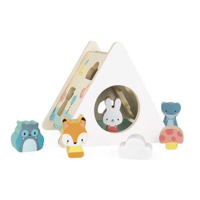 Cette jolie boîte à formes “PURE”, signée Janod, séduira autant les parents que les tout-petits. Fabriquée en bois — boîte en contreplaqué, formes en merisier — avec une peinture à l’eau aux couleurs douces et actuelles, elle propose un joli thème animalier. Elle se présente sous la forme d’un tipi fermé : les enfants insèrent six formes différentes dans les découpes correspondantes.