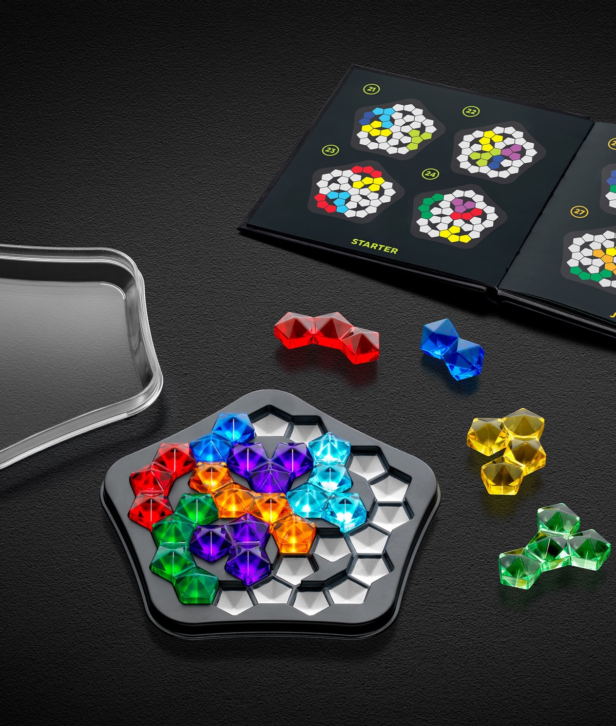 Avec IQ Carat, les joueurs sont invités à reconstituer un somptueux collier de pierres précieuses en agençant correctement les gemmes de couleur sur un plateau pentagonal.