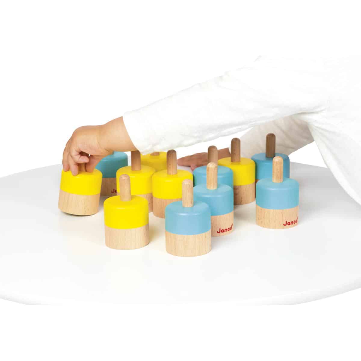 Chaque paire est composée d’une pièce jaune et d’une pièce bleue, dotées d’un ingénieux système d’auto-correction pour vérifier les bonnes correspondances. L’enfant peut y jouer seul ou à plusieurs, comme dans un jeu de mémo classique : à tour de rôle, chacun secoue une pièce jaune et une pièce bleue pour tenter de reformer les paires.